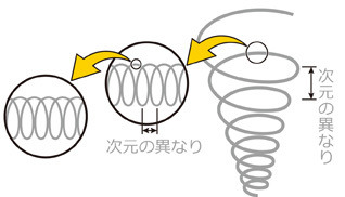 小さならせんを描きながら上昇し、それを引きで見ると大きならせんになっていて、さらにひくと、もっと大きならせんに組み込まれている。